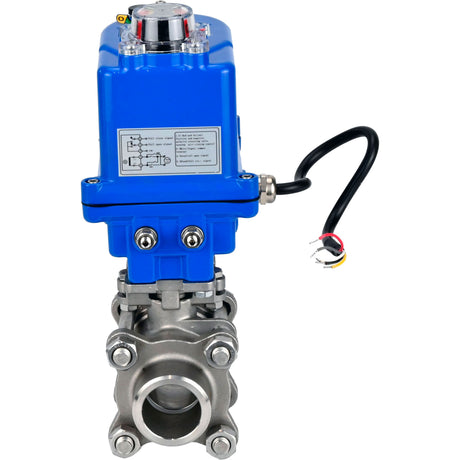 Ball valves Elephant BV3232P(3pc)-FP-W-ISO-H WDVF DN15-32 63 bar full bore, body - 316 stainless steel, seal - PTFE, for welding, with a 1/4-turn electric drive Elephant QT-N-EM-O1-220VAC-U1 blue