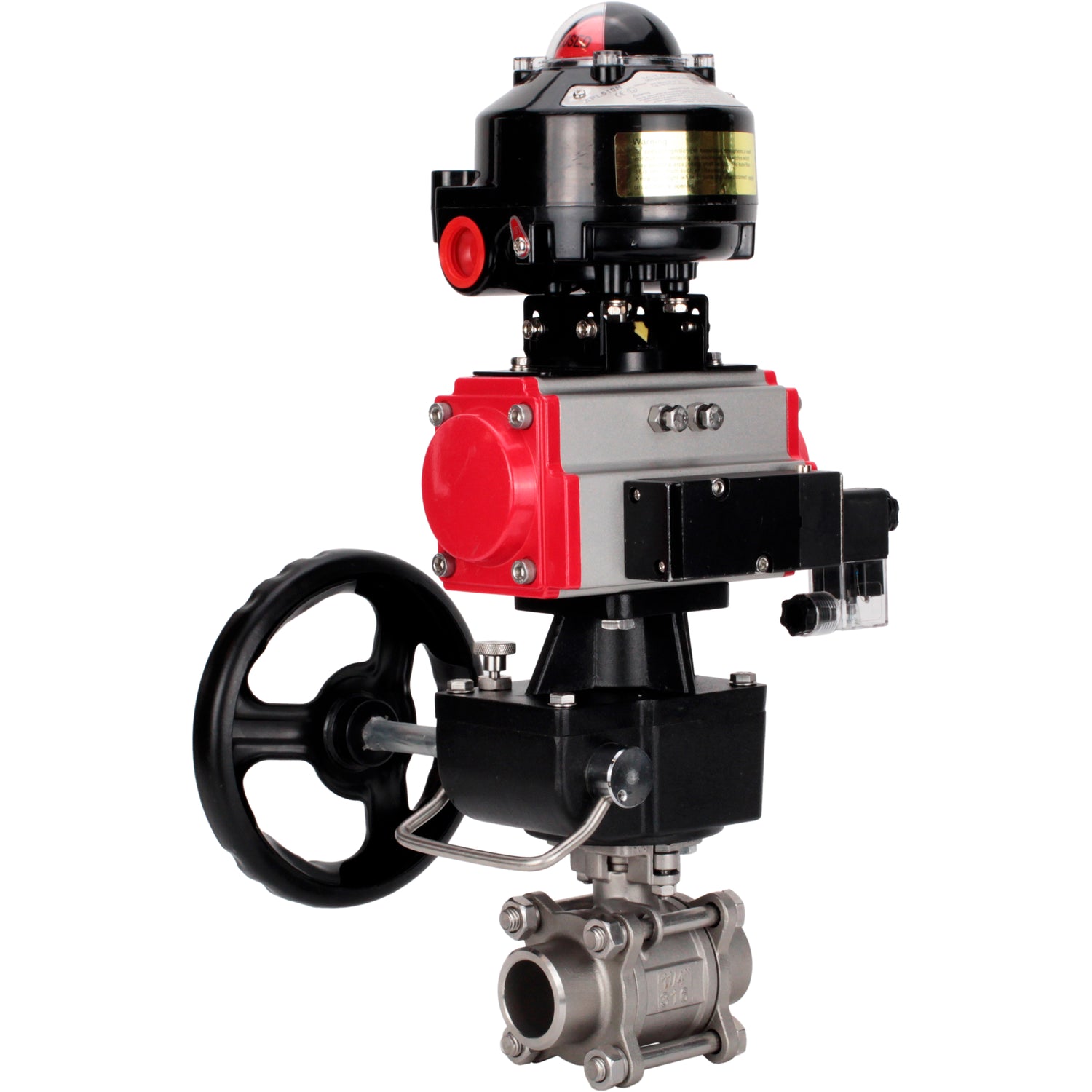 Ball valves Elephant BV3232P(3pc)-FP-W-ISO-H WDVF DN15-32 63 bar full bore, 316 stainless steel, seal - PTFE, for welding, with PA-DA pneumatic actuator, pneumatic distributor 4M310-08 220V, LSU APL-510N EX, manual backup for MON