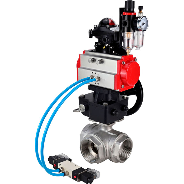 Ball valves Elephant BV3232P(4pc)-SP-3WL-T-ISO-H, body material - Stainless steel AISI 316, seal - PTFE / PTFE / Teflon, with pneumatic actuator double action PA-DA, 4V320-10 220V, LSU APL-210N, handwheel MON, ATU AFC2000