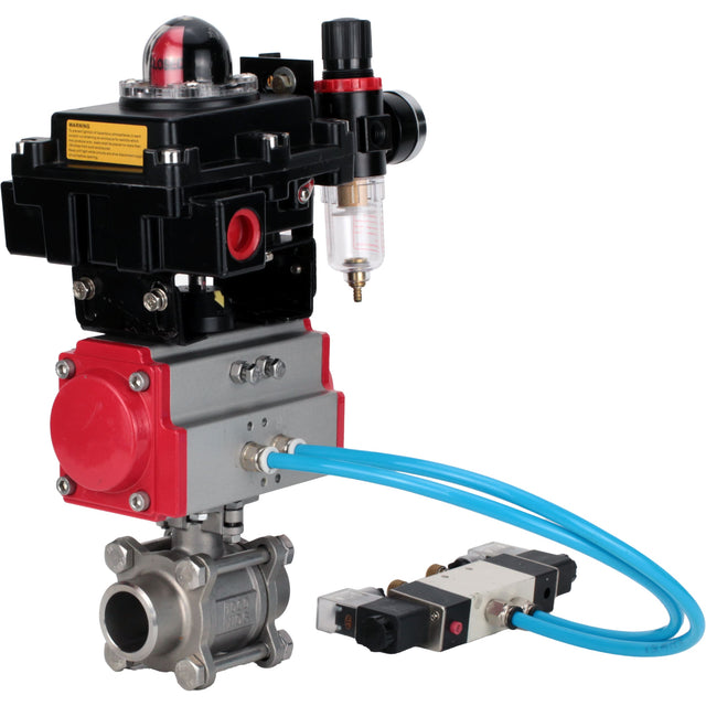 Ball valves Elephant BV3232P(3pc)-FP-W-ISO-H 16 bar/25, full bore for welding, stainless steel SS316, seal - PTFE, with double-acting PA-DA pneumatic actuator, with pneumatic distributor 4V320-08 220V, with LSU APL-410N EX, with ATU AFC2000