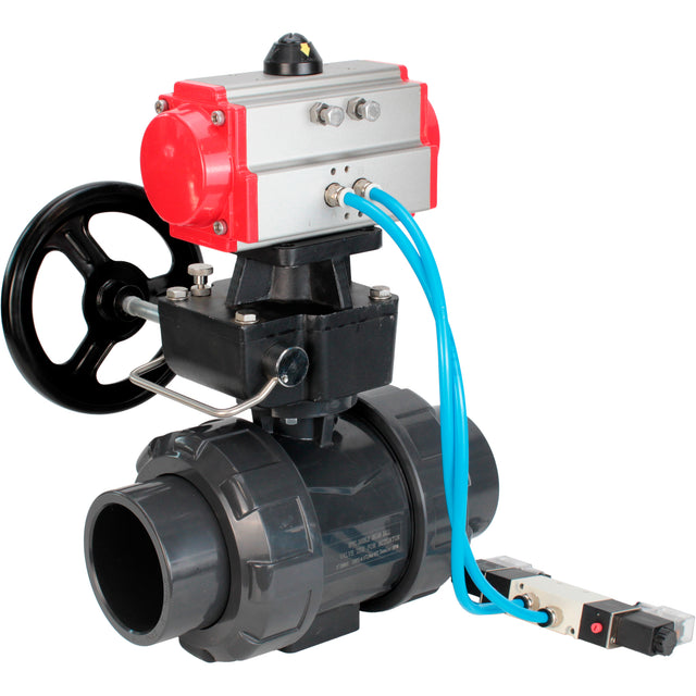 Ball valves Elephant BV4242E-FP-GRM-ISO, body material - UPVC, ball material - UPVC, seal - EPDM, with pneumatic actuator double action PA-DA, pneumatic distributor 4V320-08 220V and handwheel MON