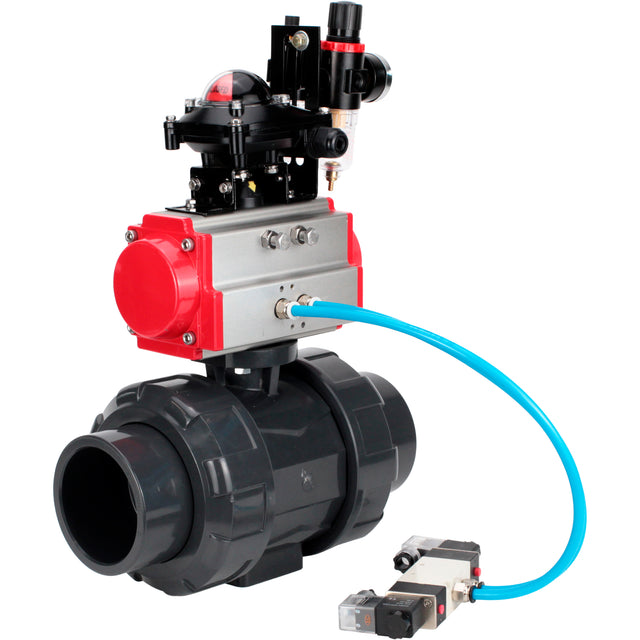 Ball valves Elephant BV4242E-FP-GRM-ISO, body material - UPVC, ball material - UPVC, seal - EPDM, with pneumatic actuator double action PA-DA, pneumatic distributor 4V320-08 220V, LSU APL-210N and ATU AFC2000