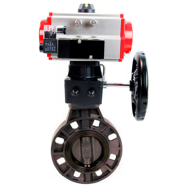 Butterfly valves Elephant WBV4242E-2W-Fb-ISO, body material - UPVC, disc material - UPVC, seal - EPDM, with pneumatic actuator double action PA-DA, pneumatic distributor 4M310-08 NAMUR 220V and handwheel MON
