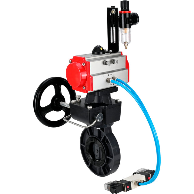 Butterfly valves Elephant WBV4242E-2W-Fb-ISO, body material - UPVC, disc material - UPVC, seal - EPDM, with pneumatic actuator double action PA-DA, pneumatic distributor 4V320-08 220V, ATU AFC2000 and handwheel MON