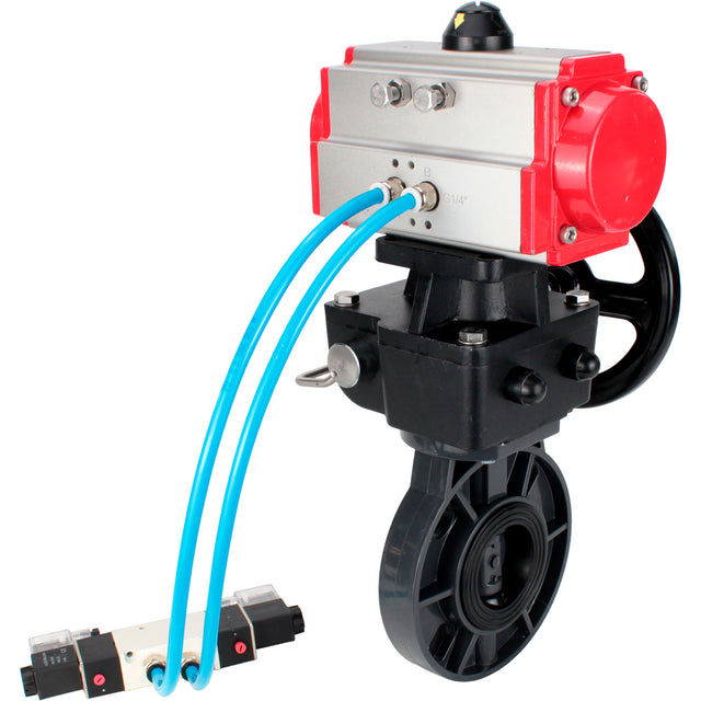 Butterfly valves Elephant WBV4242E-2W-Fb-ISO, body material - UPVC, disc material - UPVC, seal - EPDM, with pneumatic actuator double action PA-DA, pneumatic distributor 4V320-10 220V and handwheel MON