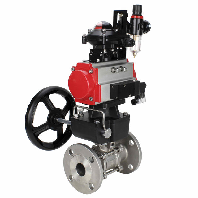 Robinet à boisseau sphérique en acier inoxydable Elephant ksfpt-304-180-da-4m310-24v-apl210n-hdm-afc2000, matériau du corps - acier inoxydable AISI 304, matériau de la bille - acier inoxydable AISI 304, joint - PTFE, actionné par actionneur pneumatique